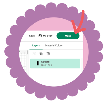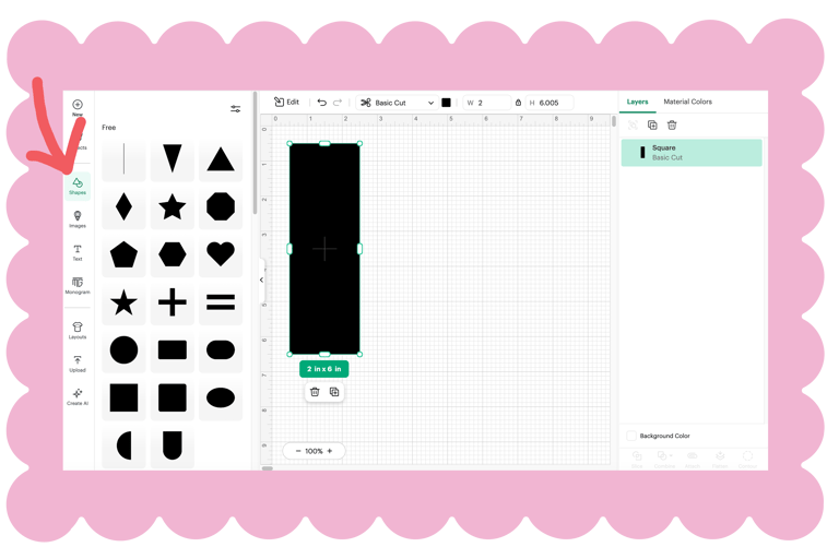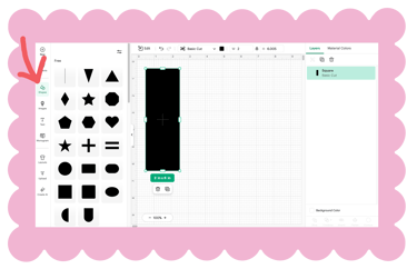 You'll open the shapes panel on the left and select the square. It will open as 2" x 2" so lets use the handle to drag the bottom to 6" so you have a standard 2" x 6" shape. Add some other shapes that you can cut from different colors of paper to glue onto your bookmark. Once you have it set up, click 'Make' in the upper left. You can choose your paper size on the left of the next screen and then click Continue on the bottom right.